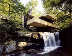 “In una magnifica foresta, uno sprone di solida roccia che sorge a fianco di una cascata… la soluzione naturale apparve quella di sospendere in aggetto la casa al suo sostegno roccioso, sopra la cascata. La prima, tra le case da me costruite, eseguita in cemento armato: e perciò la sua forma si modellò sulla grammatica di questo tipo di costruzione” (F.L. Wright) “… segna l’apice poetico del metodo organico e la massima vetta raggiunta dalla libertà creativa. ” (Bruno Zevi)