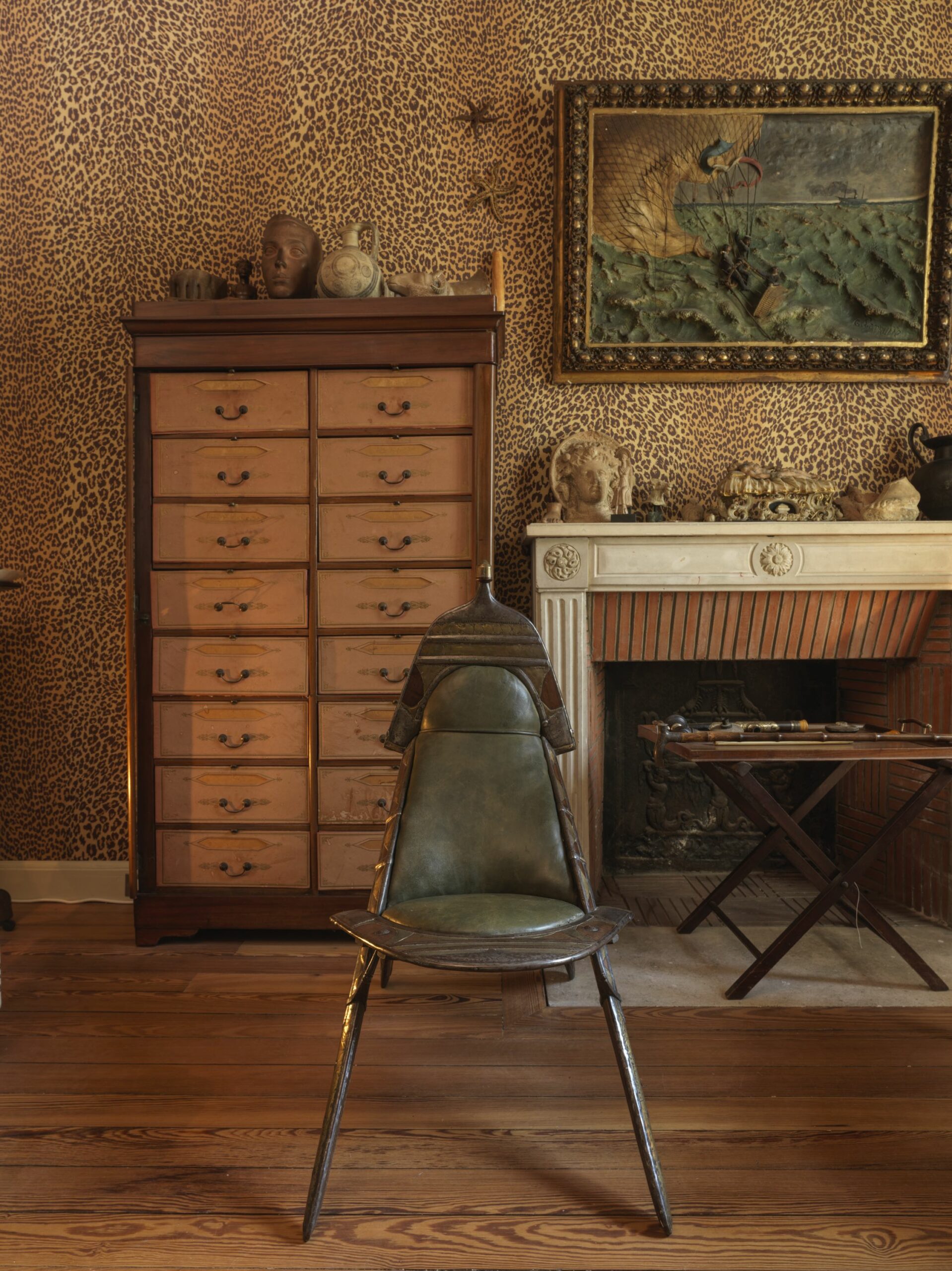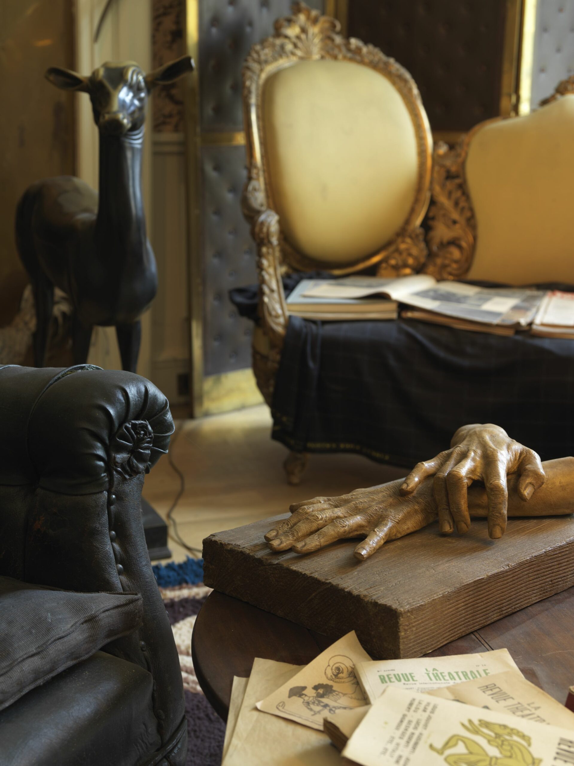 Si passa poi nel salone, in cui troneggia il tavolo da corrispondenza circondato da una molteplicità di oggetti più o meno eccentrici: non è chiarissimo se la loro disposizione sia sempre stata questa o se – come credo – la stanza sia diventata in parte il ricettacolo di elementi prelevati da altre camere, ad esempio dal piano chiuso al pubblico. Su un tavolino c’è un bel calco delle mani di Cocteau, della cui eleganza lui andava molto fiero, difatti in vari scatti lo si vede mostrarle compiaciuto; nel resto della stanza sono disseminati diversi doni di amici, fra i quali quelli di Coco Chanel.
