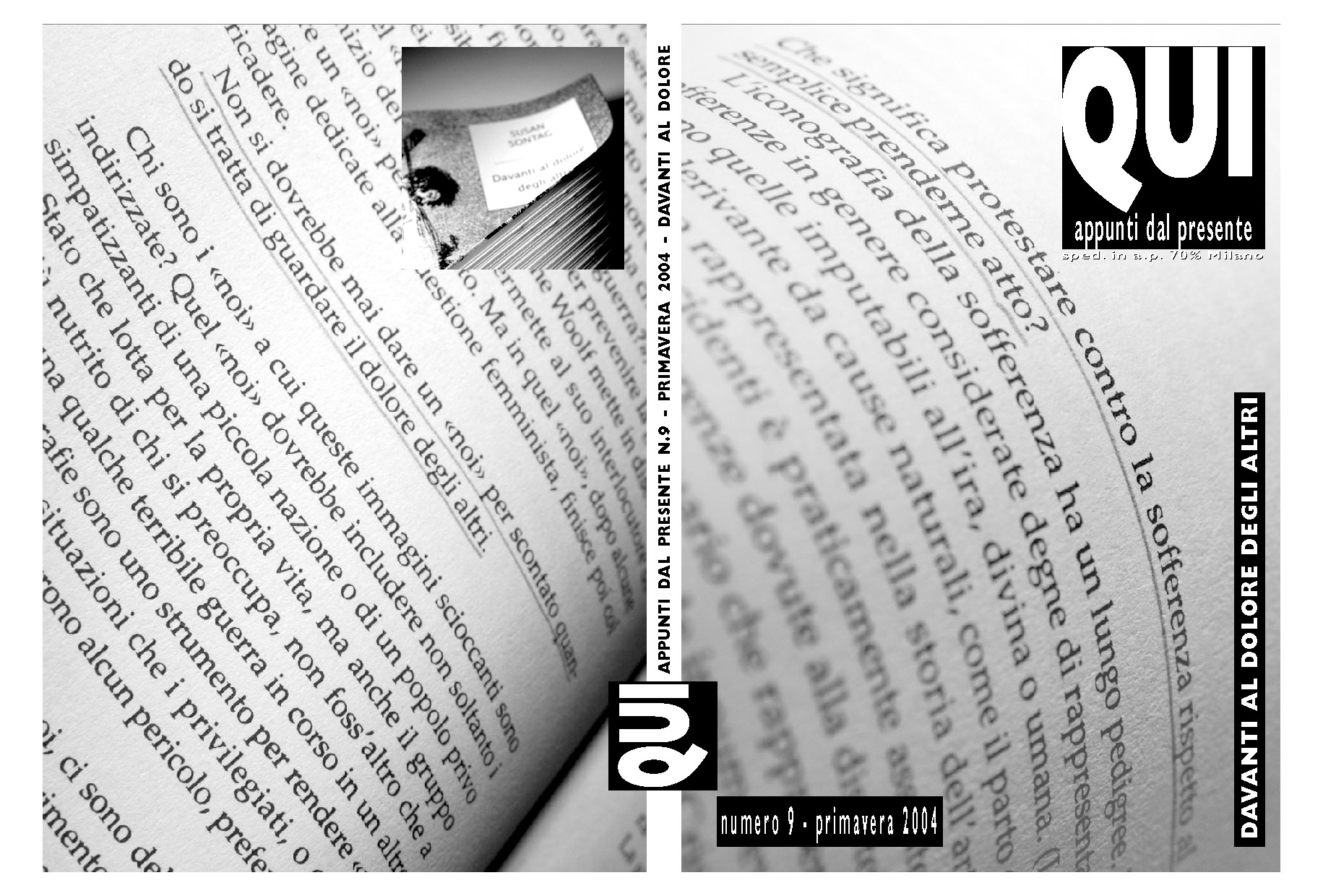 Qui. Appunti dal presente è una rivista strana, è tenacemente cartacea, eppure funziona per certi aspetti come un blog ed è presente in rete. Non è una rivista specializzata, e in questo rifiuto consiste il suo rischio e la sua forza maggiore, la sua capacità di operare uno spostamento importante rispetto a qualsiasi rivista letteraria, o legata ad un’area disciplinare (politica, filosofia, psicanalisi, ecc.). Qui è giunta oggi al numero 9. Il suo ideatore e regista, Massimo Parizzi, la immagina come un diario collettivo, corale, che però necessita di essere sollecitato e guidato (o deviato virtuosamente).