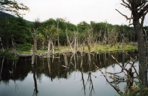 E’ passato un giorno. Il tempo è cambiato, come succede qui, che cambia continuamente anche all’interno di una stessa giornata. Adesso piove, fa freddo. C’è una luce plumbea, lunghe striscie grigie di nubi tagliano in due le montagne. Siamo nel Parco Nazionale, con le sue foreste fredde, le sue lagune e le sue baie, i faggi che qui si sono modificati e sono diventati dei sempreverdi, gli altri alberi tra i cui rami ci sono grandi sfere di vischio, dai tronchi ricoperti di licheni, attaccati da cancri ed esplosi qua e là per un’abnorme produzione di ormoni. Ce ne sono dappertutto. Grandi escrescenze esplose di legno e tutt’ intorno distese di alberi morti, scortecciati o ricoperti di licheni, perché anche gli alberi muoiono e se non vengono tolti rimangono in mezzo ai vivi. E poi ci sono i castori, che qui sono più grandi del normale, sono lunghi un metro, e portano la morte dappertutto, sono un vero flagello per queste foreste. Perché le zone dove si fermano e scavano le loro tane e costruiscono le loro dighe presentano dopo un po’ un impressionante spettacolo di morte vegetale. Distese di cadaveri verticali di alberi in mezzo agli altri alberi che qui crescono lentamente per il freddo. Ci vogliono 80 anni perché riesca a crescere un albero di dimensioni medio-piccole. Figurarsi quanti ce ne vogliono per gli alberi grandi! Si vedono ancora le zone con i mozziconi degli alberi abbattuti dagli ergastolani, quelli tagliati raso terra durante l’estate e quelli tagliati a un metro d’altezza durante l’inverno, in mezzo alla neve.