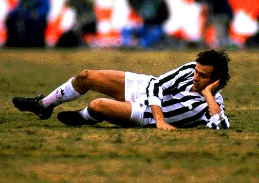 La consapevolezza ironica di Platini (nel momento in cui viene superato dal pallone, nel momento in cui decifriamo improvvisamente quello che sta accadendo sulla pagina)