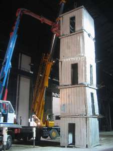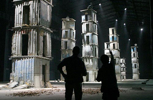 Circostanziata mi par troppo, comunque: le torri sono alte (vado a memoria) tra i 15 e i 20 metri (e comunque l’impressione che danno standoci sotto è che siano enormi e incombenti). Sono fatte di cemento e piombo, e sono state costruite in loco ricorrendo ad attrezzatura per edilizia (gru ecc). Del peso non so dirti nulla, ma credo sia notevole. I singoli moduli e le pareti riproducono la forma classica del container per il trasporto merci, sono grigie con alcune parti dipinte malamente di azzurro pallido, sbrecciate, rotte, e i tondini di metallo sporgono da ogni piano o parete. Come stiano in piedi è un mistero, l’impressione è di equilibrio precarissimo, una specie di deserto bombarbato.