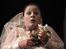 In una scena apparata come per una festa religiosa del Sud, con lumini funebri e luminarie sospese, Nina, una giovane donna in abito da sposa, e palesemente gravida, attende con i fratelli l’appuntamento con uno sposo che possa nascondere la colpa, la gravidanza frutto dei loro rapporti incestuosi. La ragazza, una bravissima Manuela Lo Sicco, porta per tutto il tempo con evidente fatica una pancia pesante, che le butta indietro la schiena , le fa assumere un’andatura grottescamente sbandata,e che ogni tanto la costringe a gonfiare le guance e a strabuzzare gli occhi (occhi liquidi, buoni e stolidi di vacca, secondo la definizione della regista). Nella fascia del vestito che stringe la pancia, Nina conserva le foto di famiglia, i ricordi angosciosi delle violenze subiti, le testimonianze dello stupro del padre sui fratelli, agitatissimi dal compito impossibile di coprire ogni traccia del passato: con il velo del vestito, alla fine, Nina si impiccherà, per uscire di scena, senza aver avuto un gesto di ribellione, o un cenno di consapevolezza.