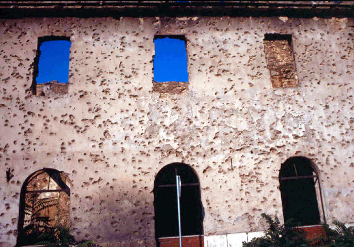 Mi sono mezzo appisolato, e apro gli occhi che stiamo entrando in Sarajevo. La sede del giornale interetnico ci accoglie, non rimane che lo scheletro di questo grattacielo sbucciato come una banana, macerie come petali a far da base alla spina dorsale del nulla.