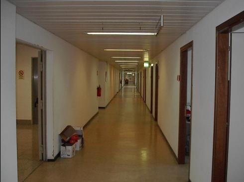 Perdersi, dunque. E ci si perde se si deve andare, mettiamo, da B2 a C, dalla stanza 1022 alla 2104 per cercare Salvatore che ha detto ieri, dopo che mi ha ospitato nel suo ufficio, quando hai un momento libero fatti vedere. Perdersi eppure ritrovarsi in questi dedali. Si deve salire al secondo piano. Ci sono le scale, da una parte e dall’altra di ogni edificio, indistinguibile il lato su cui si è, ci sono gli ascensori. Ci sono – già detto – i corridoi interni e quelli esterni, e se dagli esterni si incontrano di tanto in tanto squarci di cielo, scorci di campagna, camminando in quelli interni ci si imbatte solo, e sempre di tanto in tanto, in piccoli cortili quadrati che non avevano intenzione di essere tali, ma solo scuse per dar luce limitata e vista nulla a qualche camera. E se si è al piano terra è in questi cortili che si vedono i fumatori reietti ormai sempre più rari e i loro resti di cicche che nessuno si preoccupa di eliminare, o così sembra.