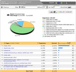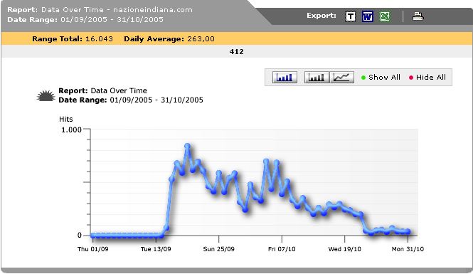 Ma ci potrebbe essere una spiegazione: dal grafico degli accessi giornalieri si vede che c’è una periodicità, con una flessione puntuale che pare avere cadenza settimanale – la risoluzione della mia baracca non mi consente di capire quale sia il giorno della settimana in cui si verifica tale flessione, ma io ipotizzo che sia domenica. Ebbene, settembre 2005 ha avuto 4 domeniche, ottobre 2005 ne ha avute 5 – potrebbe bastare questo a spiegare buona parte del calo. In più, lunedì 31 era “ponte” per molti italiani… quindi correggendo la media (ad esempio, facendo medie separate per i giorni lavorativi e per i giorni festivi) magari non si vedrebbe nemmeno questo piccolo calo.