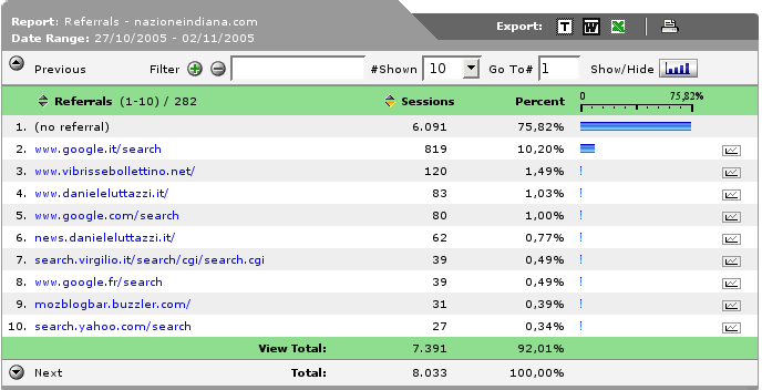Chi ha dei link verso Nazione Indiana? Oltre ai motori di ricerca, che contano oltre 3/4 degli arrivi, si distinguono Vibrisse e il blog di Daniele Luttazzi, oltre a innumerevoli piccoli siti che portano un flusso costante e suppongo qualificato di visite: grazie!