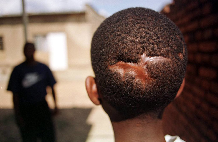 23 mars 1999, Nyamata: Jean-Paul, 14 ans, porte encore les marques des coups de machette reçus en 1994. Les milices hutues l’avaient laissé pour mort aux côtés des corps de ses parents. Au moment où a été prise la photo, Jean-Paul déclarait vouloir devenir soldat pour pouvoir se venger un jour. [brennan linsley / keystone]