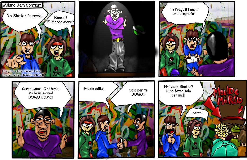 “La mia paura, è che la canzone uscirà come singolo per le radio il 16 dicembre (nei negozi arriverà solo il 21 gennaio, una settimana prima dell’uscita dell’album, NDR), proprio sotto Natale. E diciamo che la mia non è proprio una canzone da cantare sotto l’albero. Però è anche vero che il fatto che sia stata scelta come primo singolo dimostra che la casa discografica vuole presentarmi per quello che sono”. Ma chi è veramente Mondo Marcio, questa è la vera domanda arrivati a questo punto. “Io sono Mondo Marcio. Infatti fatico non poco a rispondere a questa domanda. Non è che abbia scelto questo nome per interpretare un personaggio. Le canzoni di questo album, Solo un uomo, così come quelle del lavoro uscito per l’etichetta indipendente o del Mixtape (sorta di album fatto in casa, tipico del rap americano, una specie di appunti in musica messi a disposizione del pubblico…), come pure quelle dei miei freestyle, parlano della mia vita, dei marci che mi circondano, delle cose che ho visto per strada, in giro per Milano. Nessuna finzione. Nessuna posa. Io sono Mondo Marcio e canto la vita di strada…” Mondo Marcio scoppia in una fragorosa risata, mentre con le braccia finge di suonare la chitarra. Il riferimento è ancora al pezzo del Corriere della Sera, in cui, oltre a paragonarlo a Luca Carboni, lo dipingono come una sorta di cantautore esistenziale, invece che a un rapper di talento quale è. In realtà dovrà farci l’abitudine, se a due mesi dall’uscita dell’album la soglia di attenzione nei suoi confronti è già così alta, del resto il Corriere è il principale quotidiano nazionale, e non capita proprio tutti i giorni di finirci dentro. Se per la stragrande maggioranza della gente, quella che non segue la scena hip-hop, e che quindi non sa chi siano, per dire, un Fabri Fibra o i Cor Veleno (non sto qui a spiegarvi chi sono, ovviamente, ma un giro su google vi potrebbe dare una mano, in tal senso…), il rap è quello degli stacchetti “ballati” dalle veline, o intonato da Giucas Casella all’interno del reality Show Il Ristorante, non deve sorprendere che per descrivere un giovane talento come il suo si ricorra a paragoni con Luca Carboni, cantautore il cui universo, in realtà, sembra davvero distante da quello messo in scena da Mondo Marcio.