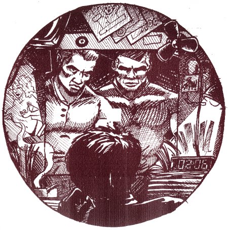 L’illustrazione di Riccardo Saviola ha, come spesso nelle cose di Mauro comparse qui, una sua storia. E’ stata spedita da Riccardo con un fax, passata allo scanner da Mauro, ritagliata e ridimensionata da me. Le rimane la grana grossa e la tonalità sporca da carta termica che secondo me è molto affine all’atmosfera del racconto.