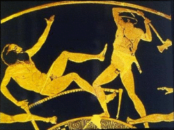 La prima corrisponde alla storia del letto di Procuste, ovvero alla storia del brigante che se ne stava appostato lungo la strada che da Eleusi portava ad Atene. Procuste aggrediva i viandanti, imponeva loro di distendersi su un letto di roccia e li percuoteva con un martello costringendoli a diventare della stessa identica lunghezza del letto. Quindi, se erano troppo bassi venivano messi in trazione e stirati, mentre se erano troppo alti venivano loro amputati piedi e gambe. Un modellamento imperioso e cruento, una forma di distruzione coatta: un regime.