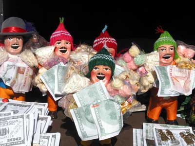 È il giorno delle Alasitas. L’idolo aymara Ekeko, che salvò dalla fame La Paz assediata dagli ultimi Incas nel 1781, invade oggi le piazze della città con un esercito di artigiani e venditori che espongono migliaia di incredibili miniature di qualsiasi cosa possa venire in mente. Dollari americani ed euro perfettamente riprodotti in scala, edizioni dei giornali, certificati di laurea e di proprietà che entrano nel palmo di una mano, passaporti poco più grandi di un polpastrello, casette tascabili con i loro bei giardinetti rettangolari, automobiline, manine, bebè, cucinini, pentolini, rane e rospi, rane e rospi dovunque, perlopiù dorati. Gli anuri a quanto pare portano fortuna, ma tutto quello che si vende e che si compra è destinato a cambiare la sorte dei boliviani.