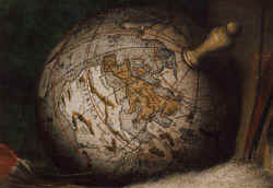 Un dettaglio significativo, visibile solo ingrandendolo notevolmente, riguarda appunto il mappamondo che si trova adagiato sul ripiano in basso a sinistra. Al centro, non diversamente da come siamo abituati, sono raffigurate l’Europa e l’Africa. Sul margine estremo si scorge pure una piccola porzione del continente americano, recentemente scoperto. Di tutte le terre emerse descritte dal mappamondo, l’unica colorata e rappresentata con una certa evidenza è l’Europa, tuttavia questa precisione si concede una non piccola licenza nel momento in cui Holbein decide di inserire il nome del paesino di Polisy esattamente al centro della composizione e con lo stesso risalto di una città importante e popolosa come Roma. Polisy era il paese natale di Jean de Dinteville, il suo feudo personale con annesso castello tuttora esistente, seppur in condizioni fatiscenti. La forzatura era naturalmente un omaggio del pittore all’effigiato, ma più profondamente credo che rifletta un’attitudine che appartiene a ciascuno di noi.