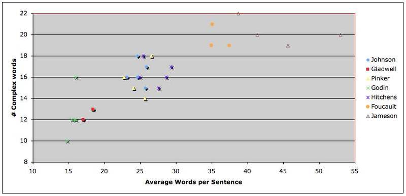Lo scrittore Steven Johnson, autore del saggio Tutto quello che fa male ti fa bene, edito in Italia da Mondadori, in un post intitolato Literary style by the numbers, pubblicato il 21/10/2007 sul suo blog (www.stevenberlinjohnson.com), confronta su un grafico cartesiano di ascisse e ordinate (vedi foto) i propri dati con quelli di altri autori, scoprendo così che se i due ultimi suoi libri hanno una media di 24,6 parole per frase, quelli di venerabili maestri come Frederic Jameson e Michel Foucault invece lo sopravanzano nettamente (per esempio Postmodernismo di Jameson ha una media di 53 parole per frase). Ma i paragoni che lo attirano di più sono quelli con colleghi contemporanei che scrivono testi simili ai suoi, e qui scopre che Malcom Gladwell, rispetto a lui, vanta delle frasi più corte del 25%; dal che ricava che il valore di riferimento cui uniformarsi è quello (“Ho sempre pensato che la lunghezza delle frasi fosse un fattore determinante per la complessità di un libro e nel tempo ho imparato a scrivere frasi più brevi”).