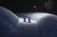 E a tratti il vuoto si accende, come le foglie graffiate dall’ultimo sole, e allora Sawako lo guarda e gli mostra la collana che lui le ha regalato quando le ha chiesto di sposarla. Poi il momento di comunicazione umana finisce, e loro riprendono a camminare. Lungo il mare e sulla neve, sui ponti pieni di fiori. Si addormentano e Sawako torna bambola, camminando in sogno lungo una distesa di maschere. Uomini mascherati la trascinano e la squartano, sotto un cielo rosso e nero come dipinto. Fa pensare al “sogno sciamanico”, che rappresentava per lo sciamano il momento decisivo di accettazione della morte dopo un lungo apprendistato basato sulla sopportazione di varie sofferenze fisiche. Questa finale accettazione coincideva con l’acquisizione della consapevolezza che i demoni che lo squartavano in sogno gli erano amici, e distruggendolo lo stavano ricreando (2). E infatti quando lei si sveglia sembra più serena, più consapevole delle sue nuove capacità comunicative. Prende in mano una foglia rossa e la guarda a lungo, come guardando la strada isolata su cui il cieco ha lasciato il suo corpo insanguinato. Si tratta di modi diversi di percepire, come quello del fan che dopo essersi accecato continua per sempre, che sia fortuna o penitenza, a vedere il viso della popstar. E se lo sciamano era l’“outsider”, che poteva comunicare con esseri non umani e per questo era emarginato, isolato dal concetto stesso di società, anche Sawako è completamente sola nella disumanità cerebrale che si è inflitta. Ma ora che ha accettato la sua morte può riempire la sua mente svuotata della bellezza dei paesaggi e a questi paesaggi comunicare, che sia un fiore o una foglia rossa. Come il rosso struggente dei fiori di ciliegio. Che come lei non durerà molto, solo tre giorni dalla fioritura. Ma è proprio per questo che è bello. Questo è il mono no aware: la bellezza che sprigiona in un oggetto la consapevolezza della sua fine imminente. Questo ideale estetico è nato nell’incontro tra il buddhismo e la sensibilità vitalista giapponese. Se il concetto di “caducità” nella spiritualità indiana portava al rifiuto dell’esistenza, simboleggiata dai cadaveri in putrefazione, in Giappone al contrario portava al pieno godimento di un’esistenza che proprio nella caducità ha il fulcro e ragione della sua bellezza. È per questo che Sawako e Matsumoto, nonostante abbiano perso sé stessi lungo la strada, continuano a camminare sotto i fiori. Ed è per questo che la stessa natura li prenderà dolcemente con sé, alla fine, giù per il pendio innevato, accarezzandoli con l’ultimo raggio di sole.