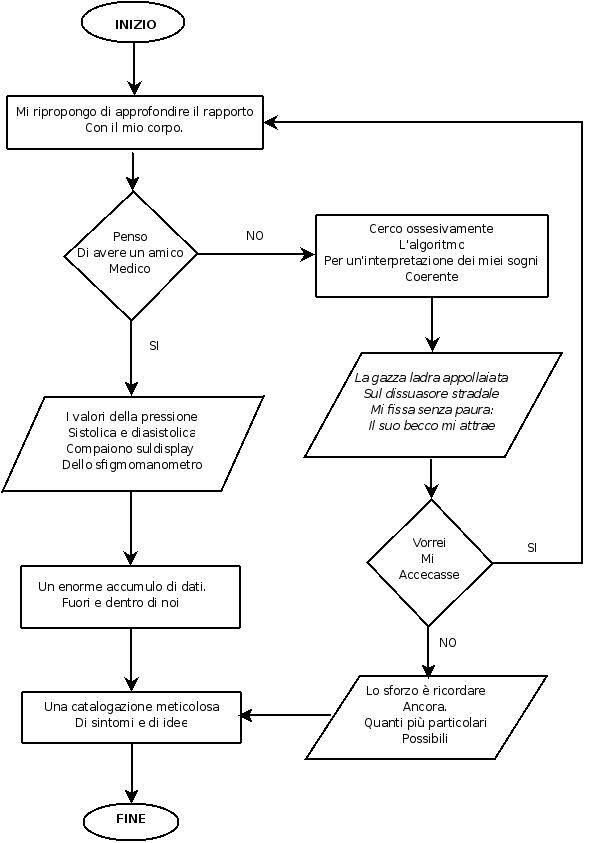 Sono diagrammi di flusso poetici che non danno scampo, si scivola sempre dove l’autore vuole alla fine trascinare. Ne vorrei uscire, ma la parola e lo schema fissano il limite. Avevo apprezzato molto quello di Elena del primo novembre e in questo mi piace l’inesorabile reazione a catena che dopo un solo sì ti immette nell’imbuto FINE (e anche dopo due no!! La negazione della negazione…)