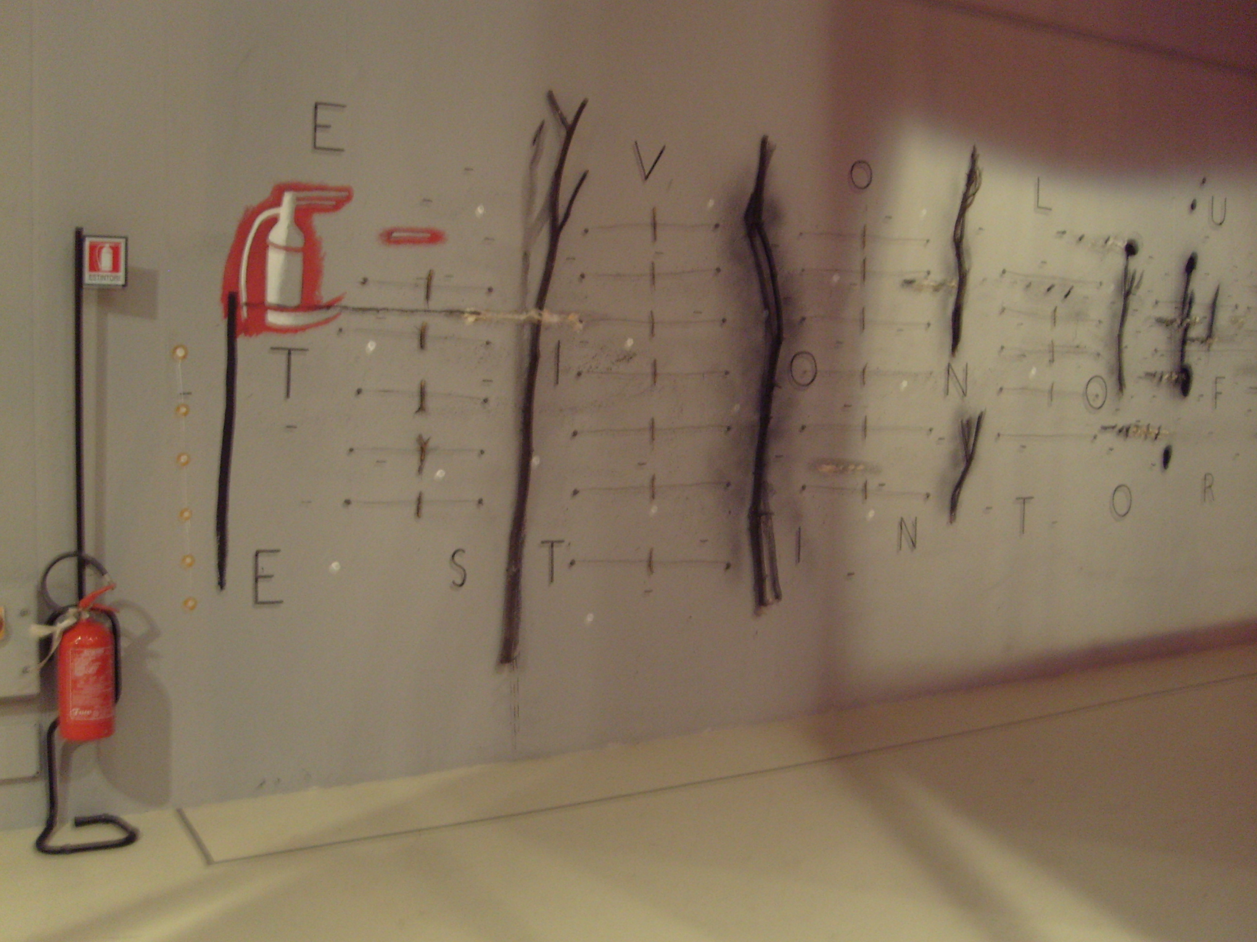 Nella Triennale troviamo poi anche un originale paesaggio, disegnato o, per essere più precisi, applicato – visto l’utilizzo anche in questo caso di materiali eterogenei come legno, cotone e filo di ferro – direttamente su una parete della sala. Vi è ritratta la silhouette di un estintore (peraltro presente anche nella sua forma reale, giusto un metro più in basso, sul pavimento) da cui partono delle linee di filo di ferro, intervallate da rami dipinti con la vernice spray nera. Campeggia su tutta l’opera una grande e chiara scritta: “EVOLU/TION OF AN ESTINTORE”.