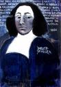 Spinoza, ovvero colui che più di tutti aveva affidato alle “passioni buone” il senso di tutta una vita, il filosofo dell’Eros, per eccellenza, non poteva che vestirsi dell’apparenza di Masaniello, oltre che ispirarsi alla forza rivoluzionaria del giovane pescatore napoletano. Amore della verità che gli costa, non si dimentichi, la celebre e violenta scomunica da parte degli ebrei ortodossi dell’epoca per non parlare del fallito attentato subito di cui portava a spasso il segno del coltello nel mantello. Ma si sa che nessuna condanna è tanto esecrabile quanto quella fatta ai giusti. Così il testo presente nel dipinto di Paolo Matteucci.: «Con il giudizio degli angeli e la sentenza dei santi, noi dichiariamo Baruch de Spinoza scomunicato, esecrato, maledetto ed espulso, con l’assenso di tutta la sacra comunità […]. Sia maledetto di giorno e maledetto di notte; sia maledetto quando si corica e maledetto quando si alza; maledetto nell’uscire e maledetto nell’entrare. Possa il Signore mai piú perdonarlo; possano l’ira e la collera del Signore ardere, d’ora innanzi, quest’uomo, far pesare su di lui tutte le maledizioni scritte nel Libro della Legge, e cancellare il suo nome dal cielo; possa il Signore separarlo, per la sua malvagità, da tutte le tribú d’Israele, opprimerlo con tutte le maledizioni del cielo contenute nel Libro della Legge […]. Siete tutti ammoniti, che d’ora innanzi nessuno deve parlare con lui a voce, né comunicare con lui per iscritto; che nessuno deve prestargli servizio, né dormire sotto il suo stesso tetto, nessuno avvicinarsi a lui oltre i quattro cubiti [circa due metri], e nessuno leggere alcunché dettato da lui o scritto di suo pugno».