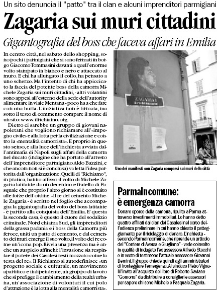 Due anni prima la città aveva conosciuto un attacchinaggio dedicato a Saviano: il suo volto, replicato decine di volte tra le “vele” di Scampia, fu come un monito a non sottovalutare il potere della parola. La parola che rompe il silenzio. Ha detto il pm Raffaele Cantone: «La criminalità organizzata, e soprattutto i casalesi, ha interesse a lavorare sott’acqua. Vuole essere lontano dai riflettori. L’interesse dei suoi boss è quello che si parli di loro il meno possibile». Così, in un’altra occasione, non molto lontana nel tempo, i volti dei boss Zagaria e Iovine comparvero nelle strade di Parma, oltraggiosamente nel cuore della Padania, come a dire: «Attenti che stanno arrivando. Persino qui.» I Casalesi furono sbeffeggiati dunque attraverso una parete -una pagina- di cemento, ovvero il materiale su cui si basa il loro potere, si ingigantisce il loro business, si consolida il silenzio.