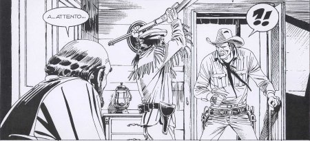 E’ un uomo d’acciaio, ha un abbigliamento preciso, armi, un modo di cavalcare, di guardare. Anche i luoghi, gli arredi, gli oggetti, devono essere verosimili, esatti. E’ un western realistico, sporco, polveroso. Io, che vengo dalla fantascienza, dove c’è molta libertà di improvvisare, ho dovuto lavorare con disciplina; sono passato dal ritmo veloce a quello lento, dove ogni vignetta va lavorata a fondo. Credo di essermi adattato molto bene alla sua serialità, perché io in fondo sono un particolarista, amo i dettagli, la precisione, la nitidezza. Mi ci sono adattato talmente bene che ora disegnerò anche un albo “normale” di Tex.
