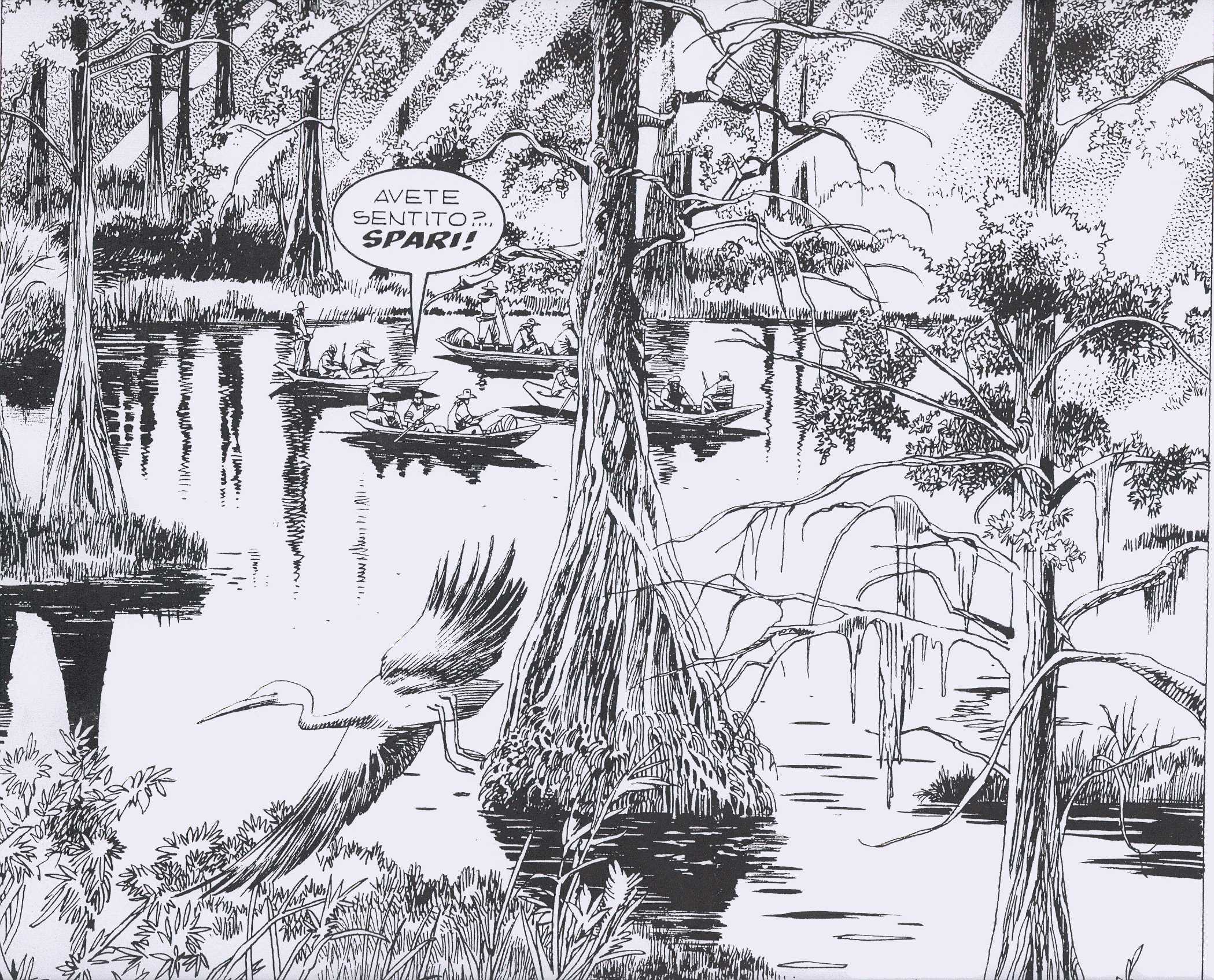 E come. Le armi, i paesaggi delle paludi, e i cavalli, che costituiscono uno dei problemi più ardui da risolvere, per l’anatomia e soprattutto il dinamismo, difficile da restituire. Ho dovuto inventare molto sui costumi dei seminoles, perché c’è pochissimi materiale disponibile. Va detto che non tutti i disegnatori dei texoni hanno fatto la stessa cosa, alcuni hanno tirato via, ma io no. In questo ho seguito fino in fondo gli insegnamenti dei miei due maestri, Magnus e Romanini (Giovanni Romanini, bolognese, ha collaborato con Magnus alla Compagnia della forca e ha disegnato i cavalli del texone dello stesso Magnus ndr), grandi maestri della precisione.