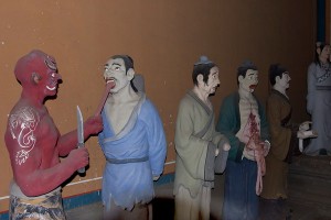 I morti sono bluastri, stravolti, laceri, con le braccia protese in avanti e lo sguardo spento, non sfigurerebbero come figuranti nel video di Thriller o in qualsiasi horror occidentale), quello della ricchezza ottenuta lecitamente stabilendo equi rapporti commerciali con la concorrenza (il dipartimento celeste si chiama proprio così e dimostra che il capitalismo in Cina è arrivato, nelle menti, da almeno settecento anni!). C’è il dipartimento dei volatili (la loro morte prematura è segno infausto di un cattivo rapporto tra l’uomo e l’ambiente. le statue raffigurano uomini con gabbie di canarini o falchi sulle spalle, altri porgono cibo a pettirossi e rondini), quello della scoperta della reale intenzione dietro le buone azioni (ricchi mandarini depongono ipocritamente piccoli oboli nelle mani di mendicanti), quello dei mammiferi (uomini con grotteschi volti di tigri, gatti, ruminanti, cervi con alti palchi di corna), quello degli animali acquatici (figure con volti di pesci e rane, una donna con una conchiglia per capelli e corna di lumaca), quello del ritorno all’uovo (il dio regge in mano un uovo del volatile in cui si reincarnerà chi si è reso responsabile di azioni indegne dell’uomo), quello della felice discendenza (dalle ricche vesti dorate della dea e del dio escono bambini ridenti), quello dei ricorsi contro condanne a vite inferiori, quello della fortuna e longevità, il più ambito, a cui non si può accedere senza aver prima lasciato una banconota presso il dipartimento del mantenimento dei monaci, quello delle epidemie, della pioggia e siccità, della vecchiaia serena, della custodia delle porte da ladri e maldicenze, e quello infine che presiede all’amministrazione di tutta la burocrazia celeste!