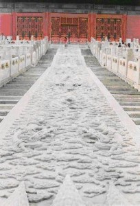 Da una parte la Città maschile, i padiglioni rossi dai tetti scanalati d’oro, i troni inaccessibili, le scalinate di marmo da cui i messaggeri, portando dispacci dai confini dell’Impero, dovevano tenersi lontani dieci passi, gli sterminati cortili che sembrano allargare lo spazio per far obliare l’orizzonte e arrestare il tempo. Incutere timore e stupefazione, portare sulla terra il vasto silenzio sovrumano della volta del cielo. Lo spazio del potere, dei palazzi dai nomi altisonanti, purezza celeste e perfetta armonia, dove l’imperatore officiava l’unione e il muto rispecchiamento della terra e del cielo, luogo trasmutato in simbolo. Il suo emblema? La lastra di pietra scolpita con figure di draghi e onde posta obliquamente al centro della scalinata del padiglione principale: lunga 17 metri, larga tre e spessa un metro e mezzo, è stata ricavata da un unico blocco di pietra estratto da una cava nel nord della Cina. Non vi erano i mezzi all’epoca per trasportare le sue 200 tonnellate. Così sono stati scavati e riempiti pozzi ogni 800 metri lungo tutto il percorso. D’inverno ne sono stati estratti i cilindri di ghiaccio ed è stata creata una pista di ghiaccio su cui far scivolare la lastra fino al Palazzo dell’Imperatore. O la montagna di giada conservata nel Museo dei Palazzi Orientali: un cristallo di giada screziata alto due metri e mezzo per cinque tonnellate. Partendo da una provincia lontana, fu trasportato a Pechino su un carro trainato da cento cavalli e spinto da un migliaio di uomini. Lungo il percorso si dovettero affrontare passi montani, e furono costruite strade, e attraversare fiumi, e furono gettati ponti. La Montagna di giada impiegò tre anni ad arrivare nella Città Proibita e da lì fu spedita a sud per ordine dell’Imperatore, affinché esperti intagliatori la scolpissero riproducendo un dipinto caro al sovrano che raffigurava la leggenda di Dao Yu che addomestica le acque. Servirono sei anni perchè il capolavoro smisurato potesse varcare le porte della Città Proibita.