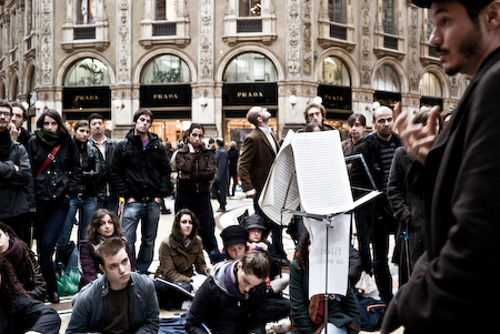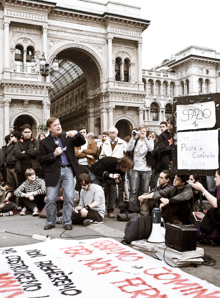 [Pubblico il testo della lezione che Lorenzo Bernini ha tenuto in Galleria Vittorio Emanuele a Milano il 31 ottobre 2008, corredato da fotografie di Giovanni Hänninen che documentano la manifestazione tenutasi a Milano in occasione dello sciopero della scuola del 30 ottobre e le “lezioni in piazza” tenutesi in piazza Duomo e in Galleria Vittorio Emanuele il 24 e il 31 ottobre. Le “lezioni in piazza” sono un’iniziativa organizzata dagli studenti e dai docenti (strutturati e precari) dell’università per dare visibilità alla protesta in atto contro la “riforma” della scuola stabilita dal “decreto Gelmini” (decreto-legge 137) divenuto legge il 29 ottobre, e contro i “tagli” all’università previsti dalla legge finanziaria (legge 133). L’iniziativa sarà estesa, a partire da questa settimana, anche ad alcune piazze delle periferie di Milano: il 12 novembre a partire dalle 16:30, su invito del comitato inquilini Molise-Calvairate-Pozzi, mobilitato contro il rincaro degli affitti delle case popolari, si terranno lezioni in piazza Insubria. Il 14 novembre è previsto lo sciopero dell’università e della ricerca, con corteo nazionale a Roma.