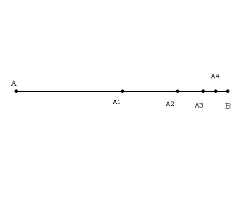 Tutti sapete, e vedete in questa figura, cos’è un segmento AB; anzi sapete anche che contiene tanti punti quanto un’intera retta, cioè aleph, e via dicendo. Allora prendete AB e dividetelo a metà, chiamate A1 il punto di mezzo. Ora considerate la seconda metà delle due ottenute, cioè il segmento A1 B, e dividetelo a metà, ottenendo così il punto di mezzo A2. Analogamente ottenete i punti A3, A4, ecc. dividendo sempre a metà l’ultima metà precedentemente ottenuta.