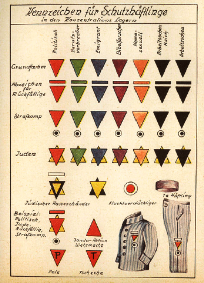 Che dire poi della altrettanto maniacale classificazione di insegne sulle divise a righe, che prevedeva e catalogava quel che quell’uomo-numero era, così da definirlo a prima vista, come i gradi di un esercito analogo e disperato?