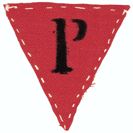 con il triangolo rosso dei politici cucito sul petto