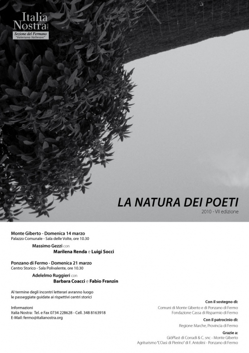 Anche quest’anno La natura dei poeti, la rassegna di “Poesia e natura” curata da Adelelmo Ruggieri e Massimo Gezzi per Italia Nostra sez. del Fermano e giunta ormai alla VII edizione, ospiterà poeti giovani e nuovi, molti diversi stilisticamente l’uno dall’altro: i due appuntamenti del 7 e del 14 marzo vedranno protagonisti, infatti, quattro giovani poeti italiani, due marchigiani (Luigi Socci e Barbara Coacci) e due provenienti da fuori regione (Marilena Renda, siciliana ma di residenza romana, e Fabio Franzin, veneto).