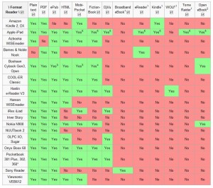 Ti allego un’immagine (tratta da Wikipedia) con una matrice formati/device relativa al mondo degli e-book. Prova a osservare le aree verdi, è chiaro che il panorama è variegato ma è anche chiaro che dispositivi non-specifici come l’iPad hanno un vantaggio competitivo forte rispetto agli altri, la possibilità cioè di incorporare più facilmente una pluralità di formati e modelli d’uso dell’e-book. Se oltre ai device portatili avessero messo anche un semplice PC la linea sarebbe stata verde continuo… L’altra osservazione immediata è che txt, pdf, ePub sono i formati più diffusi. Il primo essendo troppo minimal e il secondo proprietario, questo depone fortemente per un vantaggio dell’ePub come formato di tendenza nei prossimi mesi/anni. Ma questa matrice è estremamente limitata e molti altri punti di osservazione potrebbero essere aggiunti. Quindi non costituisce uno strumento predittivo adeguato. Credo che l’unica previsione sensata che si possa fare costituisca quasi una tautologia: i prossimi mesi saranno mesi di intensa variazione, con mille proposte nuove e una co-evoluzione di formati, software di lettura, device.