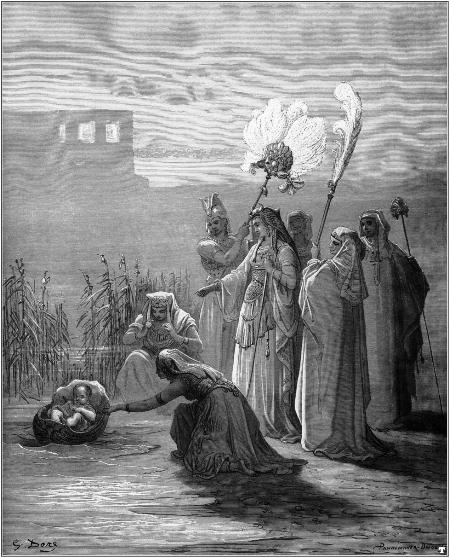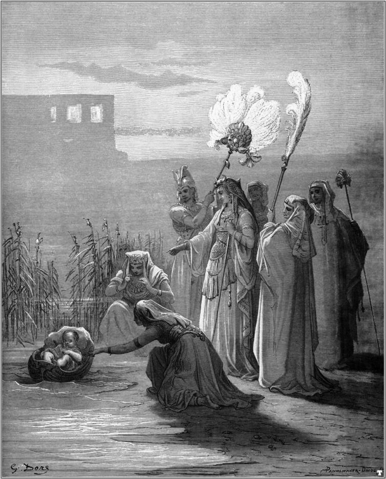 Io, la sognatrice, aspetto ai piedi dei gradini. Non ho idea di chi io sia, o di come sia arrivata là. Non c’è un prima o un dopo, è un momento perfetto nel tempo o fuori dal tempo. Io sono preoccupata per qualcosa, tuttavia. Attendo sotto il gradino più basso. Là, nell’acqua di fianco a me, c’è un cesto poco profondo o una cassa o una scatola o una barca. C’è, naturalmente, un bambino deposto in essa. La principessa deve trovare il bambino. So che troverà questo bambino. So che il bambino sarà protetto e messo al sicuro da lei e che la questione è tutta qui. Tutti abbiamo visto un’immagine simile. Io mi impressi questa immagine da bambina, prima ancora di saper leggere, nella nostra Bibbia illustrata dal Doré.