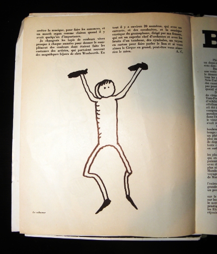 Il mio primo acrobata fu un saltatore che aveva gambe fatte di filo di acciaio, mani di piombo, il corpo rivestito di velluto giallo e una testa fatta da una pezzetto di tappo con capelli e baffi dipinti ad acquerello. Lo si lasciava cadere dalla parte dei piedi e dopo molte giravolte e avendo fortuna, lui ricadeva sulle mani. Lo trovai molto riuscito quando un’amica mi disse che assomigliava a suo padre.