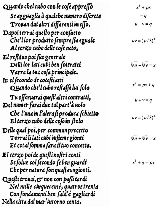 (l’immagine mostra le terzine con le quali il bresciano Niccolò Fontana detto il Tartaglia forniva al pavese Girolamo Cardano una chiave per la formula risolutiva dell’equazione di terzo grado: la vicenda è raccontata qui, con gusto e dovizia di particolari)