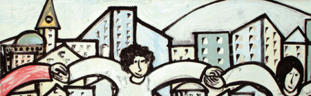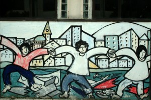 La fotografia è tratta dalla scheda progetto sul sito del GRIDAS. E’ un particolare di una foto scattata da Francesco Di Martino il 14 novembre 2009 a un pezzo di mural realizzato da Felice Pignataro nel 1999 nel cortile di una scuola di Scampia (periferia nord di Napoli). Fai clic per ingrandirla.