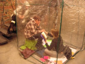 Avevo montato una casetta (la cui vera funzione è quella di serra) in mezzo a una stanza e i partecipanti vi entravano uno ad uno. A questo punto si sedevano su un piccolo sgabello e io gli mostravo un “campionario” di temi: città, animali, solitudine, distruzione, odio, amore, ispirazione, sesso, gatti, sole, cielo: loro sceglievano i temi e io leggevo le poesie corrispondenti.