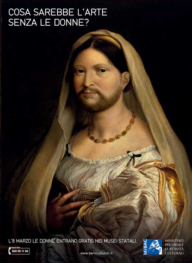 Il manifesto del Mibac, invece, è il fotomontaggio di due ritratti tipici proprio del Rinascimento. Purtroppo non so a chi appartiene il volto barbuto prestato alla “Velata” (qualcuno può aiutarmi?), ma credo non ci sia dubbio che l’operazione parta dal mettere insieme un immagine canonica di bellezza femminile con una altrettanto tipicamente maschile.