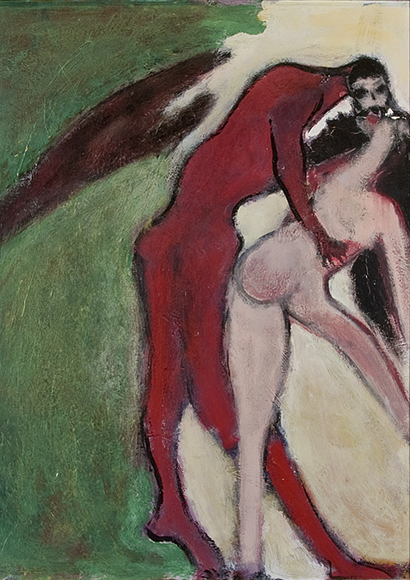Innanzitutto la natura non è quasi mai presente nei lavori della pittrice; Annino si occupa principalmente di corpi umani e animaleschi, anche se questi vengono travolti tutti dalla tempesta perfetta della de figurazione. Questa poi è a servizio della leggerezza che rimane il filo rosso delle meditazioni della nostra. Leggerezza non vuol dire però l’edonismo smaccato di cui parlava Matisse; la pittura si occupa anche del male e delle difficoltà umane, anche se l’orizzonte di una cupezza senza rimedio rimane estraneo all’Annino. Ecco dunque gli esseri deformarsi, stirarsi, allungarsi e perdere senz’altro i segni della realtà e dell’empiria.