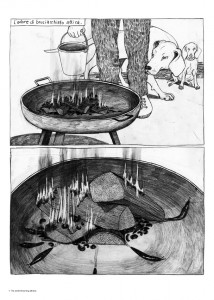 Ogni parola produce immagini e su tale parallelismo si fonda la comunicazione. Gli studi di logica del filosofo e matematico tedesco Gottlob Frege ci consegnano la spiegazione nel disegno di un semplice triangolo: su un angolo abbiamo il segno, su un altro il senso, su un altro il significato. Nella coesistenza di queste tre cose sta il linguaggio. Il fumetto di Anke Feuchtenberger è, in questo senso, un perfetto e alto esemplare di linguaggio, che comunica a livelli plurimi, che coraggiosamente raccoglie una storia da terra -nel vero senso della parola- e la rende dicibile, comunicativa, evocativa, sfruttando il passaggio attraverso i canali più ancestrali e meno corrotti o corruttibili dell’immaginazione, proponendo una storia del minuscolo, una storia originale e poetica, che si fissa nella retina (grazie anche al grande formato del libro) a lungo, concedendo al lettore il tempo di persistenza che serve alla riflessione attraverso la quale si chiude il triangolo che, partito dal disegno e passato attraverso l’immagine, approda alla significazione, condivisibile o anche semplicemente personale.