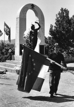 Pietro sta sistemando le bandiere. C’è l’arcobaleno della Pace, le bandiere della Cgil Fillea, quella dell’Italia, e quella blu dell’Europa che è un pugno allo stomaco su quel grigio.