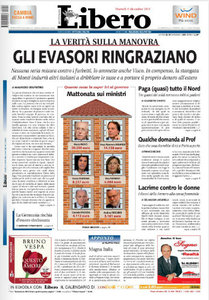 Grazie al pendolarismo, l’altro giorno sono riuscita a sbirciare le testate vicine al partito in grado di esercitare la pressione più forte sul governo. Salgo sul treno con sullo stomaco “Grazie ai nostri sacrifici, IL DIO SPREAD E’ SAZIO” de Il Giornale ostentato nell’edicola della stazione, ma resto incredula quando mi capita sotto il naso una copia abbandonata di Libero: GLI EVASORI RINGRAZIANO. Il titolo del giorno prima – GOVERNO CHE CHIAGNE E FOTTE – sembrava copiato dai commenti in rete con cui i contribuenti di sinistra e reddito medio-basso sintetizzavano la loro rabbia. Il rebus Trova le differenze si risolve un po’ meglio leggendo gli editoriali.