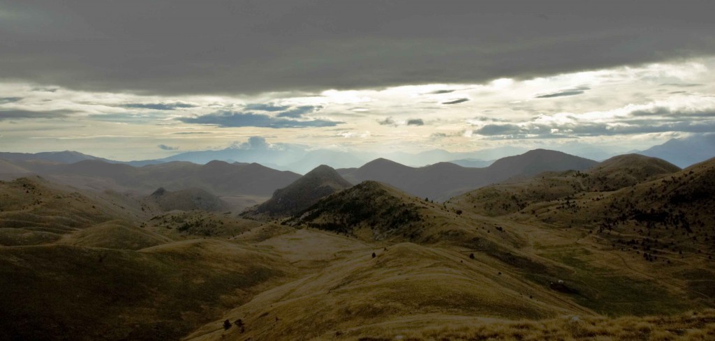 Camminiamo sulla cresta sempre uguale del monte Gorzano. Da quota 1800 dobbiamo raggiungere quota 2400, la vetta con la croce e il manto di neve anche d’estate. I gradoni d’erba che dalla fine della strada dividono il camminante dalla quota sono sempre uguali e ogni 10 metri creano un gioco di prospettive che fa sembrare la vetta a vista. Miraggi continui e cadenzati. Il Gorzano è un monte arcaico, poco frequentato, che ha un tanfo di muschio simile a quello dello scatolone del presepe in cantina. Si supera un gradone e si comprende che la vetta è ancora lontana, è una montagna che ti prende per scoramento. Tra un gradone e l’altro incontriamo Romeo, un giovane pastore macedone. Ci segue da un po’, cerchiamo di evitarlo ma conosce palmo a palmo le traiettorie di chi cammina su questo suo giardino stagionale.