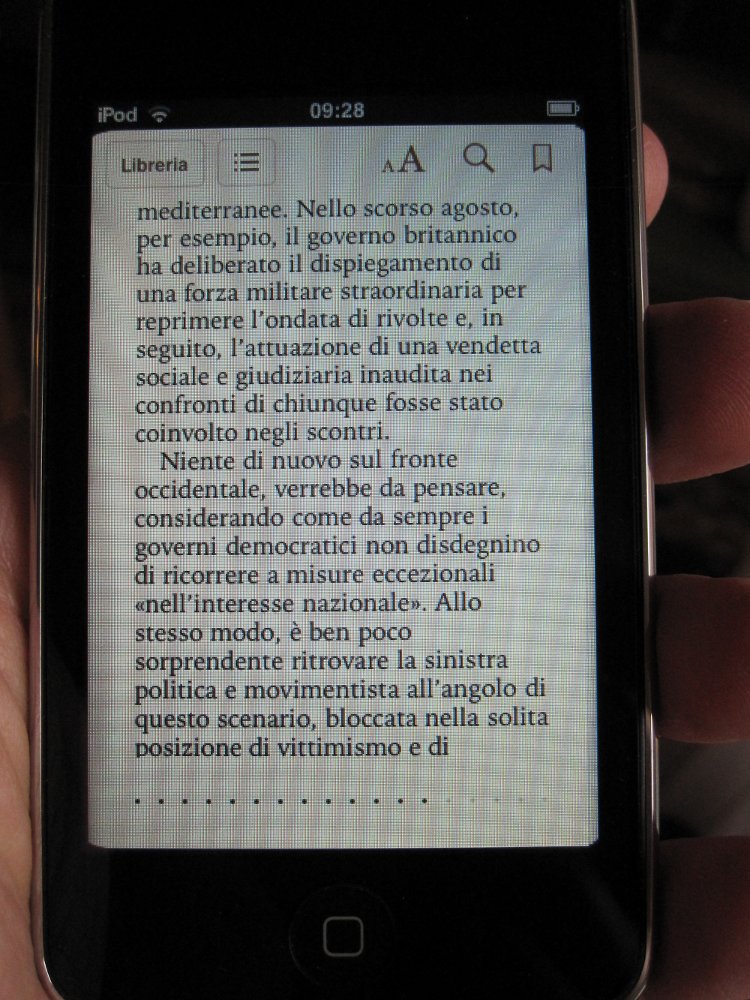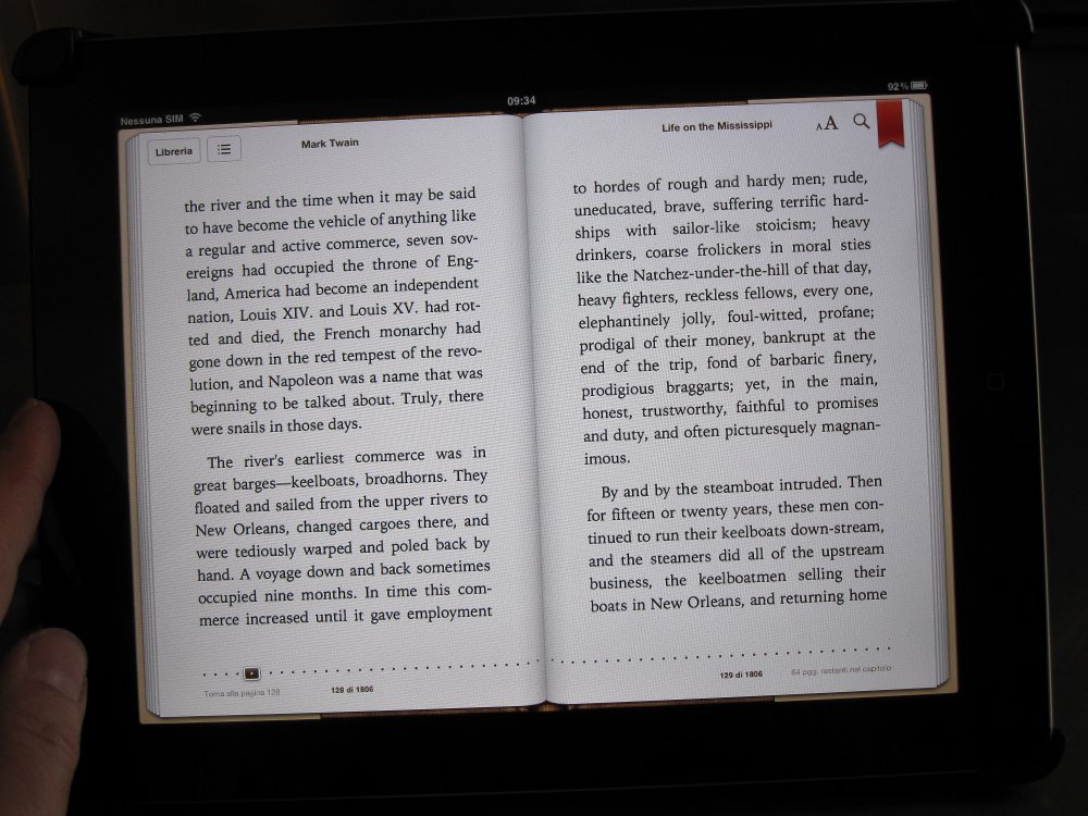 Sempre riguardo iBooks, merita un discorso a parte il tablet iPad su cui iBooks visualizza libri in grande formato. La lettura di ebook su iPad soffre dell’affaticamento visivo dovuto allo schermo luminoso e non ha la maneggevolezza dell’iPhone; va bene per materiali ricchi di immagini e link in rete, ma sul testo puro è un ripiego.