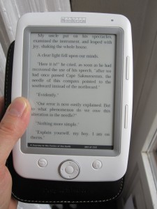 Questo è un Bebook mini, reader piccolo preso due anni fa. Ha lo schermo e-ink, non illuminato e leggibile accanto alla lampada del comodino o sotto l’ombrellone. Lo schermo è di soli 5 pollici in diagonale, di sfondo grigino tipo carta riciclata, buona leggibilità generale. Attualmente contiene qualche centinaio di libri e riviste, nella memoria interna e nella scheda sdhc.