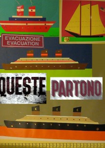 Golette e velieri, Billy Budd, Benito Cereno, Lord Jim, Joseph Conrad, Herman Melville, fino alla leggenda dentro la leggenda: Sinbad il marinaio, il Flyng Dutchman, e poi la realtà contemporanea; il Titanic, Andrea Doria, il Flyng Enterprise. Le guerre non contano. Ma chi ha detto: “E naufragar m’è dolce in questo mare…” Poeti, poeti, i poeti non contano. Neanche Ulisse conta, un addict del naufragio (zattera), naufragi a puri scopi sessuali. Vent’anni di naufragi pur di non tornare a casa, pur di giacersi con maghe, circi, calipse, nausiche verginali , matrone, veggenti e servette , – un latin lover – che appena ha cominciato a perdere colpi, a battere in testa, ha di colpo ritrovato la strada marina per Itaca, senza spettacolo, liscio liscio, ed eroe per burletta, (ma loro lo credevano eroe) si è riaffondato nell’innaufragabile Penelope mater e magistra ( l’enciclica non c’entra) che lo ha unto e bisunto per la millesima volta e se lo è stravolto che dire allo stralunar di pizzi e ciondoli di veli, i fioretti assaettati negli arrembaggi, ed in salto mortale nella scialuppa strabordante nei flutti, la Lei di Lui, irreversibilmente figlia del suo peggior nemico e per cui lasciata al suo destino, il cuore del Corsaro spezzato, ma neanche un fremere di ciglia.