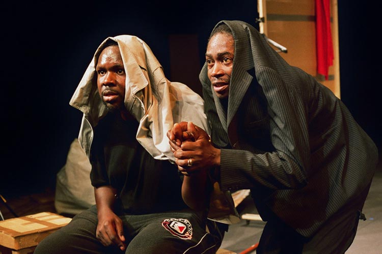La tragedia, anche qui, affiora tra le risate, e il rinculo da senso di colpa delle risate è la cosa peggiore in assoluto. Però, lo sforzo da fare è: immaginare come Peter Brook abbia messo in scena questa storia. Styles, Robert, i due attori che prestano carne e ossa ai personaggi, sono immersi in uno spazio completamente spoglio. Nel vuoto del teatro, niente dà l’impressione di una scenografia tradizionale. Solo dei cartoni, due sacchi, un bastone, sgabelli ricavati da cassette, cornici di ferro con due rotelle per farle muovere, una scarpa. Tutto qui. Ma l’assenza, la sparizione del mondo, dura appena pochi secondi. Perchè gli attori con le parole, i gesti precisi quanto affilati, e la maestria con cui dispongono del proprio corpo, rimpolpano velocemente la scena, le danno spessore, la rendono viva e vibrante.