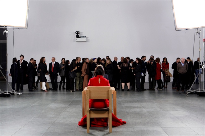 Nella retrospettiva al MOMA, documentata nel film “The Artist is Present” di Matthew Akers e Jeff Dupree, l’Abramović è restata per tre mesi, impassibile, seduta su una sedia mentre a turno i visitatori potevano accomodarsi su una sedia di fronte. È impressionante vedere la quantità di gente che è scoppiata a piangere, o che si portava la mano all’altezza del cuore all’apice dello struggimento, mentre lei non faceva altro che fissarli uno ad uno col suo sguardo addestrato, con disciplina ferrea, a sembrare constatemene intenso.
