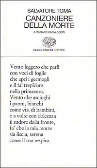 In questa rarefazione, come ci dice la Corti nell’Introduzione al volume, troneggia la donna favolosa del poeta, questa volta una figura concreta, altera, che appartiene al mondo reale, con la quale un Franz visionario prova a rapportarsi, per la quale, ci confessa, sarebbe disposto a rinunciare ai propri versi. Il ‘Canzoniere’ di Toma si apre con una dedica al maestro Leopardi, che ha liberato/ l’Italia/ più di Garibaldi. La familiarità del poeta con la morte è docile, inevitabile, connaturata alla sua condizione di maledetto e nasce dalla considerazione che solo chi si nega la vita/ sa cosa significa vivere. Al poeta risulta impossibile diffidare di chi lo accompagna perennemente, annunciandosi con sonagli d’oro, come un’ombra, un chiodo fisso, senza segreti.